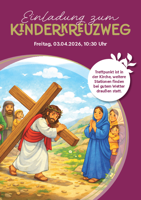 am Karfreitag, 03.04. um 10:30 Uhr zum Kinderkreuzweg in der Pfarrkirche (bei schönem Wetter gemeinsamer Kreuzweg von der Kirche zur kleinen Schule)
