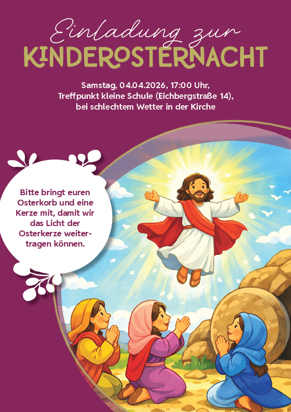 und am Samstag, 04.04. um 17:00 Uhr zur Kinderosternacht vor der kleinen Schule (Eichbergstr. 14), (bei Regen in der Kirche).
